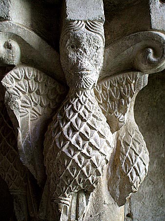 Capitell nº 12Capitell amb decoració de temàtica zoomòrfica. Representa tres animals fantàstics amb cos, ales i potes de falcó i cap d'home. Estat lleugerament mutilat. Decoració del plomall de les aus idèntic al del Capitell nº 8, tot i aquest representa un animal fantàstic amb cos de falcó i cap d'home. En allò que es refereix a la temàtica, es similar al Capitell nº 23, tot i que la decoració de les plomes és diferent. Segons la classificació de capitells de tot Catalunya feta per Puig i Cadafalch, aquest capitell pertany a Grup quart, de temàtica íntegrament zoomòrfica. Bibliografia. |