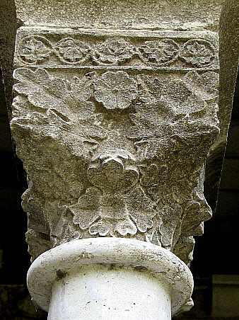 El nº 18 (esquerra) de temàtica vegetal, molt imaginativa i elaborada, de fulles sobreposades i cargolades sobre tot l'espai disponible del capitell cantoner.