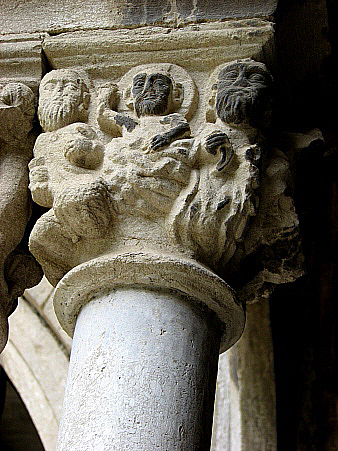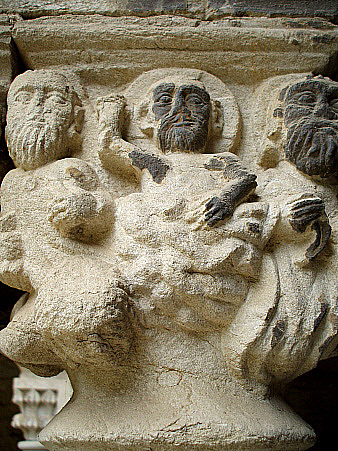 Una interpretació de l'escena correspón al Judici Final, interpretant la figura a l'esquera de Crist com un pecador, basant-se en que la part inferior de la figura serien les flames de l'infern, i el cap als seus peus, un àngel. Una altra interpretació explica que seria una escena del Sant Sopar, atenent a una possible aura darrera el cap de les dues figures lateral, que serien apòstols, i la figura de terra seria Judes. En una altra de les cares, dues figures assegudes, amb mantell, amb els caps ajuntats, que podria ser la continuació de l'escena anterior, si fós el sant sopar. En una tercera cara, un grup de quatre figures desfiles agades de bracet; no és té un significat prou basat per identificar l'escena. |