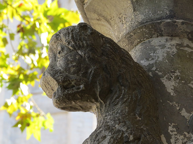 Està tallada en pedra calcària nummulítica de Girona i mesura, inclosa la columna, 366 x 46 x 38 cm, està partida en nou fragments i presenta restes de policromia del segle XIX. Precisament va ser al llarg del segle XIX quan es va crear una certa ambigüitat pel que fa a la seva identificació, atès que sovint era descrita com una mona, i més tard com una lleona. Malgrat tot, aquest argument no va guanyar pes, ja que el lleó era un animal habitual en el repertori iconogràfic i simbòlic de l’edat mitjana a Europa.