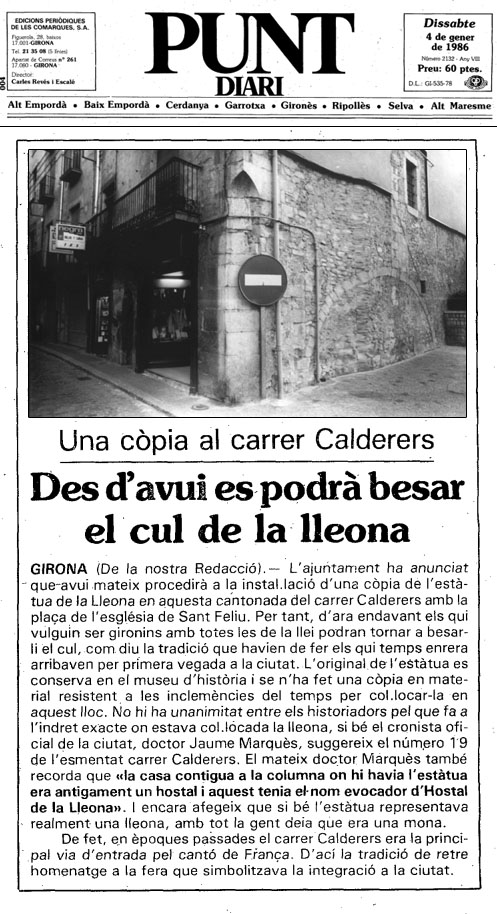 Notícia de la instal·lació de la rèplica del Cul de la Lleona al carrer dels Calderers. Article publicat al diari 'El Punt' el 4/1/1986 - (Ampliar)