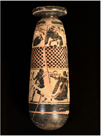 (Imatge vertical: alabastre grec amb figures dionisíaques. Ceràmica àtica de figures negres, Segle V aC. Empúries, L’Escala).