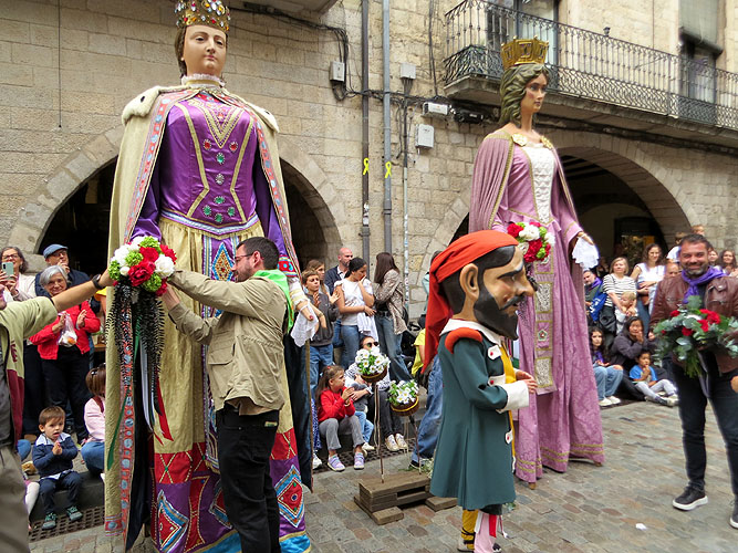 Arribades les gegantes a la plaça del Vi, les germanes Roser i Anna Maria Recasens, que porten la botiga "Recorda-te’n", l'alcalde de Girona, Lluc Salellas, i el 2n tinent d'alcaldia i regidor de Cultura, Quim Ayats, varen canviar els rams de les gegantes. Seguidament varen ballar els gegants i les gegantes.