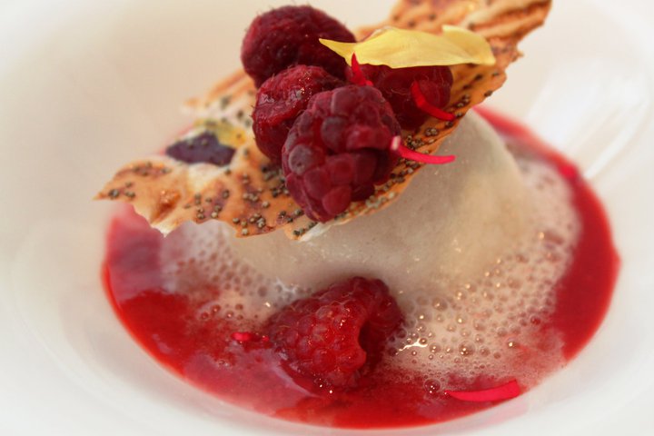 Llagostí amb flor de pastanaga i aire de coco amb comí (Fotografia: La Calèndula)