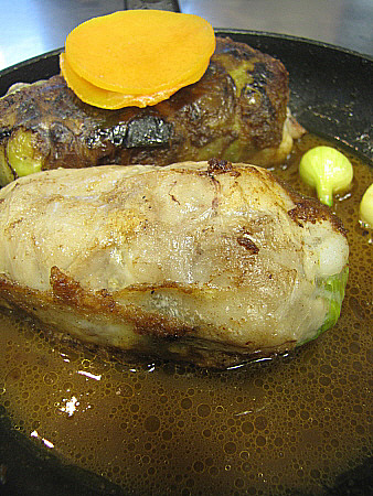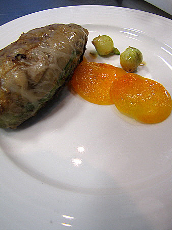 Peu de porc farcit de farcellet de col setsemanera amb nap negre i mill