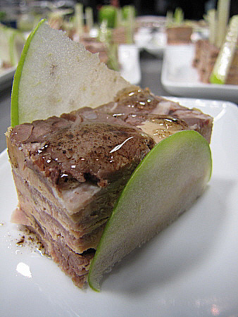 Llengua de vedella amb fetge d'ànec, vainilla, poma verda i brots