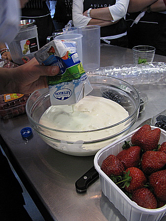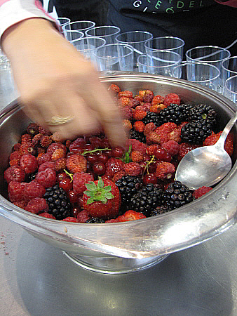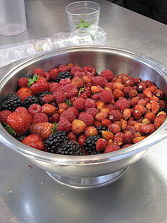 Infusió freda de maduixots amb fruits vermells, granisat de sangria i mousse de recuit d'ovella