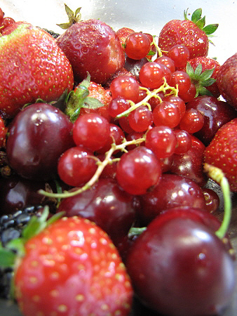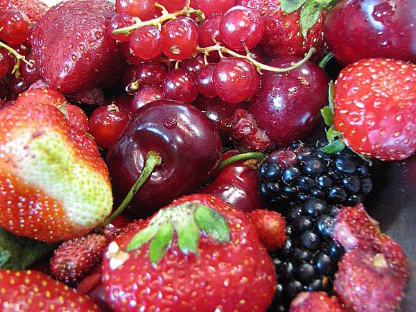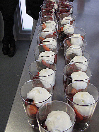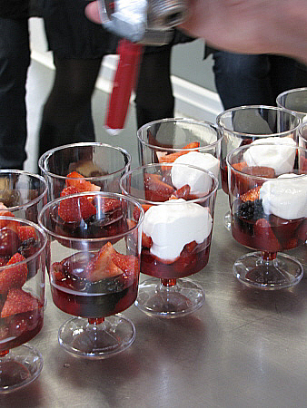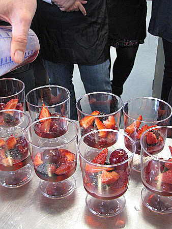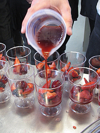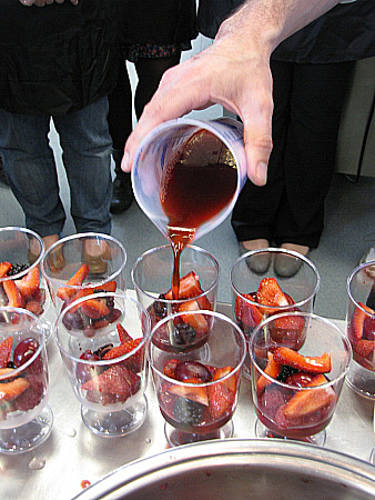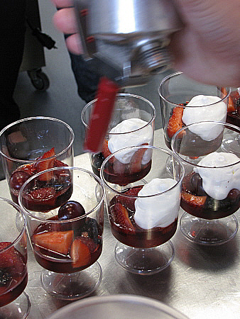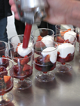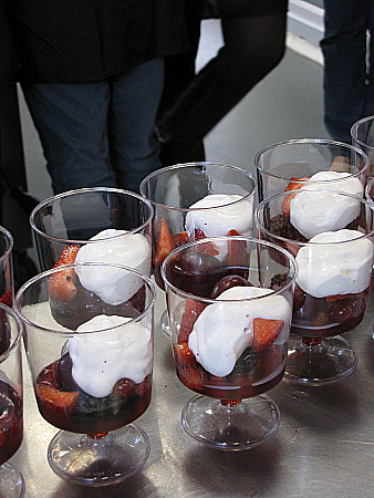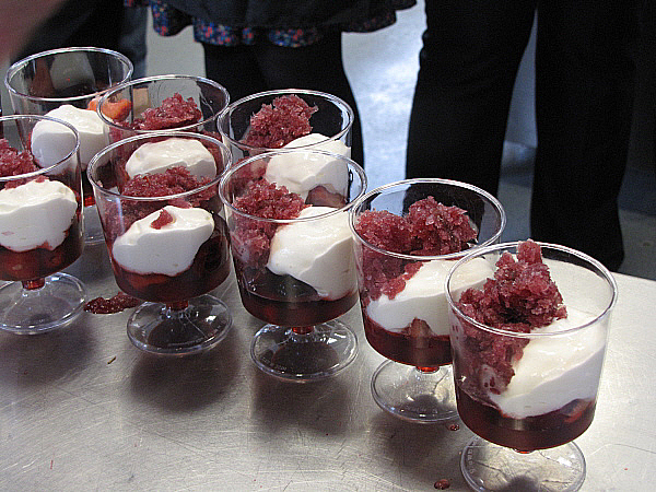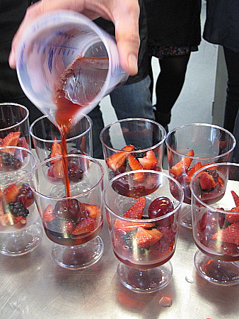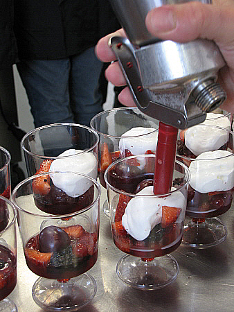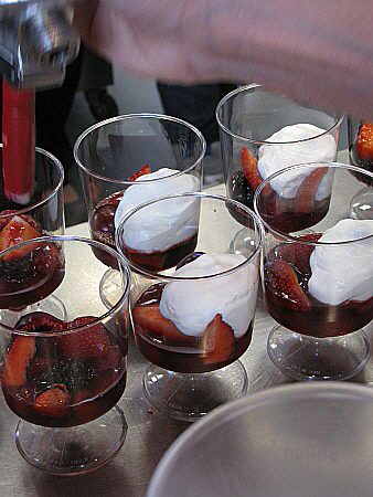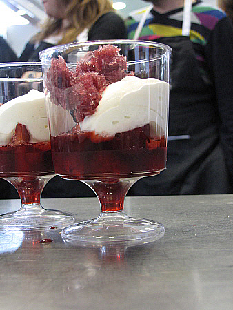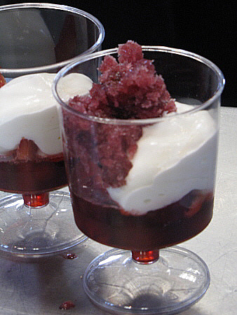 Infusió freda de maduixots amb fruits vermells, granisat de sangria i mousse de recuit d'ovella
