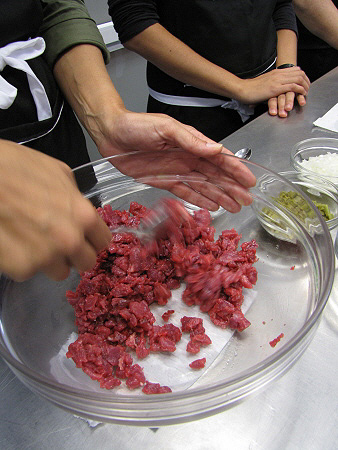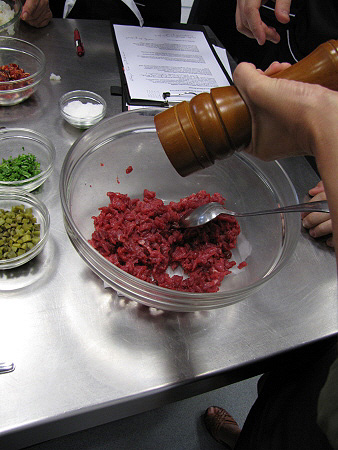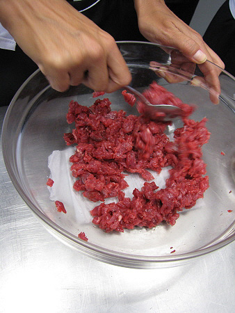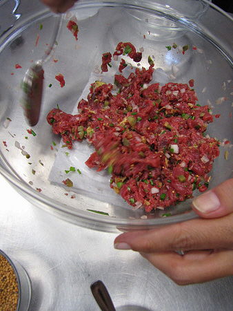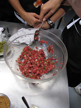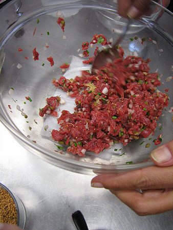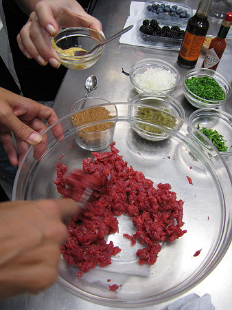 Tàrtar de poltre amb mòres, mostassa i ceba cruixent