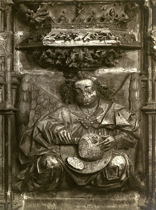 Representació d'un àngel amb el pa senyat en acció de llescar-lo. Detall del retaule de l'altar major de l'església de Santa Maria de Castelló d'Empúries, de la segona meitat del segle XV. 1915. Valentí Fargnoli i Annetta. CRDI - Ajuntament de Girona - (Ampliar)