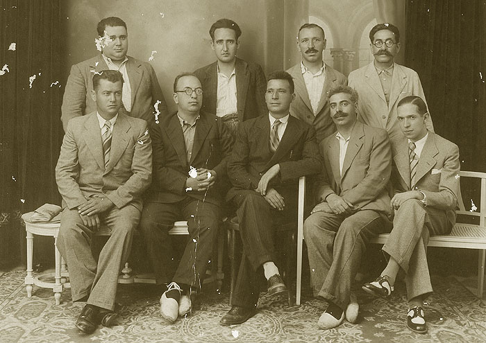 Retrat de grup dels membres de la Federació de Flaquers de les Terres Gironines. A dalt, Taularia, Llonch, Centenys. A baix: Teixidor, Arilas i Joan Dalmau Pla, amb fleca al carrer Hortes. 1930. Joan Barber Garriga. CRDI - Ajuntament de Girona - (Ampliar)