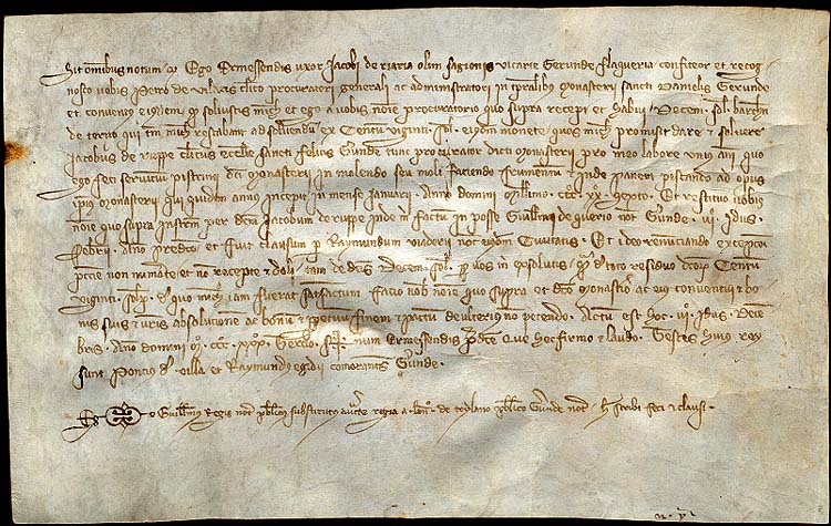 11 de desembre de 1333. Ermessenda, muller de Jaume de Riera, en altre temps saig de la vegueria de Girona, flequera, realitza una àpoca a Pere de Vilacís, procurador del monestir de Sant Daniel de Girona, de deu sous, restant el deute de cent vint que el monestir tenia a l'atorgant com a paga del servei de fleca d'un any. Monestir de Sant Daniel - (Ampliar)