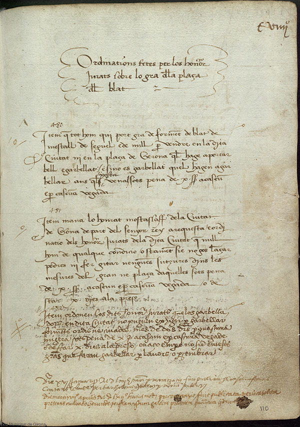 (Ampliar) - Ordinacions sobre el blat. Llibre del mostassaf. 1450. Fons Ajuntament de Girona.