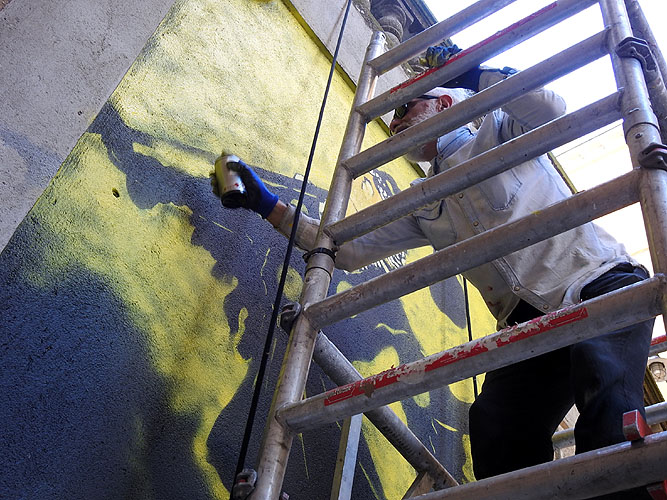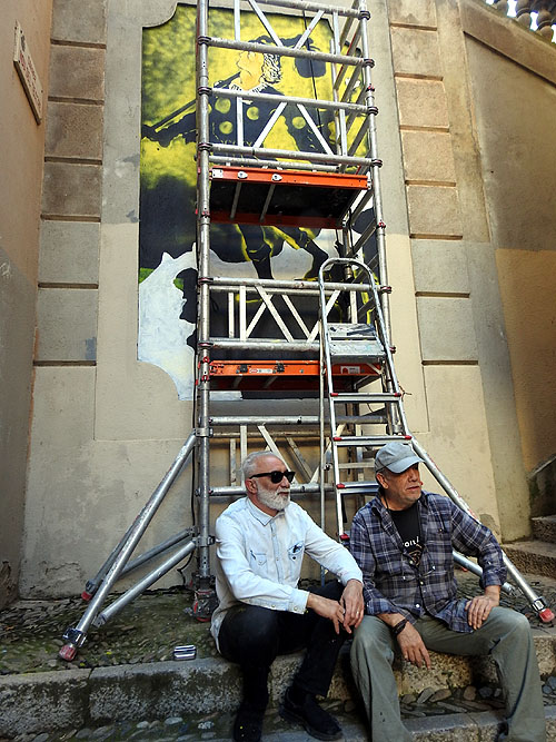 ![]() (Ampliar) - Procés de pintat del mural, amb Pep Admetlla i Jordi Amagat. ![]() (Ampliar) - Pintura del mural avançada.
