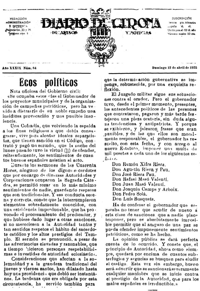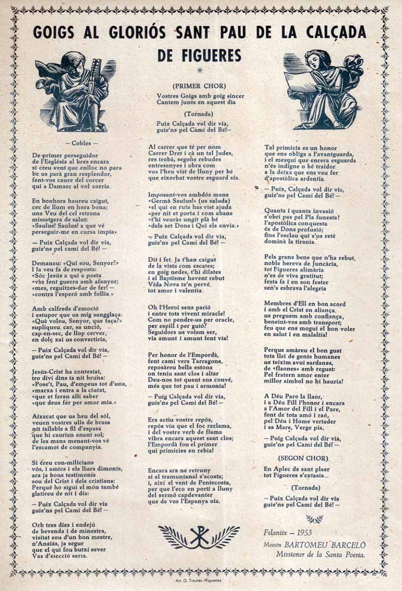 ![]() (Ampliar) - Mossèn Bartomeu Barceló el 1925, quan es va exiliar per primera vegada. ![]() (Ampliar) - Notícia del 'Diario de Gerona de avisos y notí:cias' del 12/4/1925 amb la nota de premsa de les autoritats sobre el sermó de Barceló. ![]() (Ampliar) - Mossèn Bartomeu Barceló el 1925 a Perpinyà. Imatge publicada per Bartomeu Mestre, op. cit. ![]() (Ampliar) - Juli Lluís Maria de Carsalade du Pont (Cimòrra, Gers, 1847 - Perpinyà, 1932) bisbe d'Elna-Perpinyà del 1900 al 1932, l'anomenat "bisbe dels catalans". Viquipèdia. ![]() Mossèn Bartomeu Barceló i Tortella. Imatge publicada a l'article de Mn. Camil Geis de 1973 a la Revista de Girona ![]() (Ampliar) - Goigs a Sant Pau de la Calçada de Figueres, per mossèn Bartomeu Barceló, 1953. Font: bloc Algunsgoigs. ![]() (Ampliar) - Mossèn Bartomeu Barceló i Tortella dibuixat per Joan Maimó. |