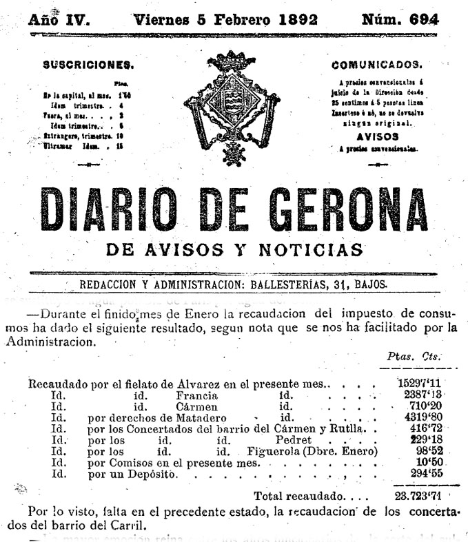 El 4/8/1891 el "Diario de Gerona de avisos y notícias" publicava: "Ayer á las tres de la tarde cerca la fuente del Rey, fué detenida y decomisada por los empleados del ramo de consumos una ternera viva, que procedente de la Crehueta era conducida á Sta. Eugeríia apesar de haber manifestado el conductor su procedencia y destino, no solo á los apreensores sino al jefe del fielato del Carmen á donde fu&eeacute; conducida. Pero pasó el asunto a la Delegacíon, se resolvió, como es lógico y justo que siendo el animal vivo no cabia el decomiso; conviene pues que los empleados del ramo se enteren bien de las circunstáncías en que procede el decomiso para evitíar no sólo perjuicios y molestias como las del caso que nos ocupa, sino también para no dar motivo á que aumente la aversión á un impuesto ya de sí odioso. Por fortuna el espíritu recto y justiciero de la superioridad pone al público á cubierto de cualquier exceso ya sea malicioso ó de buena fé". -