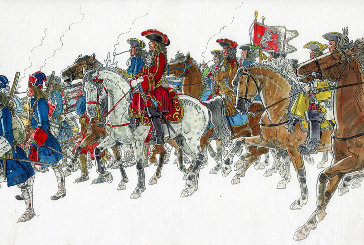 Antoni Desvalls, la seva Plana Major i l'exèrcit regular. Desvalls hi és en mig del seu estat major i del seguici de nobles que l’acompanyaven com a guàrdia de corps, entre els quals el coronel de fusellers Amill, el tinent coronel Ramon de Rialp del regiment de cavalleria Sant Jaume, el coronel de cavalleria Jaume Brichfeus, el capità Diego Nassarre del regiment de cavalleria La Fe, el coronel Josep de Peguera i Cortit senyor de Gràa i els germans Josep i Geroni de Castellvell entre altres. La tropa és formada per soldats professionals magraners provinents de la guarnició de Cardona. Dibuix de Francesc Riart (Vibrant) - (Ampliar)