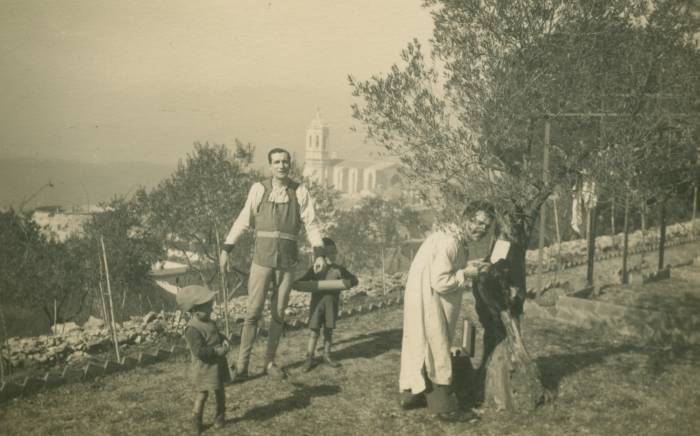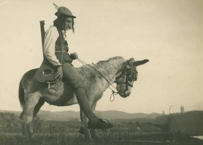 (Ampliar) - Escenes del rodatge de la pel·lícula "Castillo Maldito". Proves del rodatge amb Jesús Portas, vestit de trobador i C. Aranjuelo en primer terme. 1949-1950. Fotografia de Francesc Boladeras Molinas. Fons Antoni Varés, Ajuntament de Girona