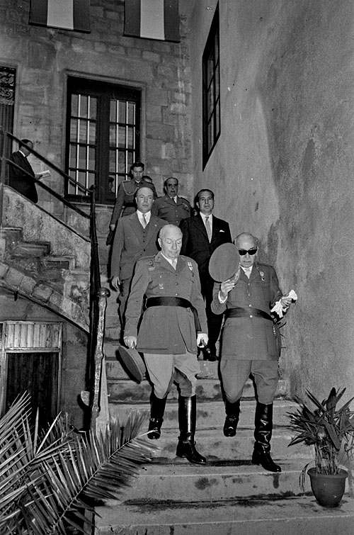 (Ampliar) - Actes de commemoració del 150è aniversari dels Setges a Girona de 1808-1809a. A primera fila, d'esquerra a dreta, el capità general de la IV Regió Militar Pablo Martin Alonso i el governador militar Joaquin López Tienda. Al darrere, d'esquerra a dreta, el governador civil i cap provincial del Movimiento Josep Pagès Costart i l'alcalde de Girona Pere Ordis Llach. 1959. Pablo Garcia Cortés. CRDI - Ajuntament de Girona.