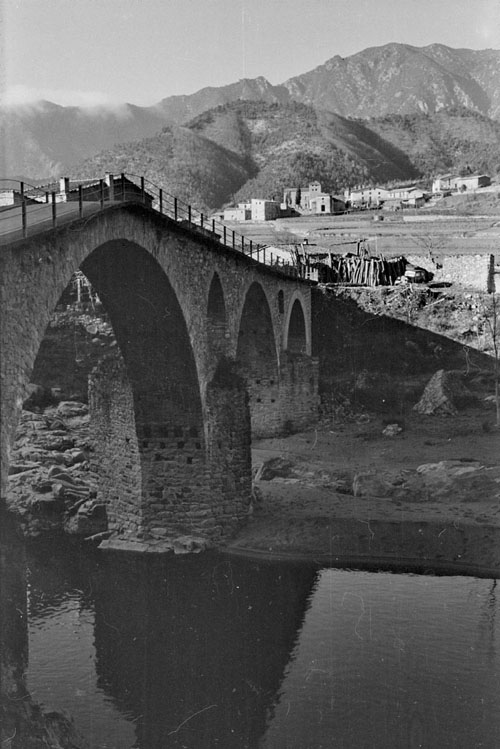 El poble de Sant Martí Sacalm o Sant Martí de Cantallops centra el pla de Sant Martí, dominat per la gran cinglera del Far, que forma part del terme i de la demarcació parroquial. Comprèn un petit nucli de cases al voltant de l’església parroquial de Sant Martí, esmentada ja el 1197, de la qual resta una part romànica del segle XII, havent estat del tot transformada al segle XVII. Sembla que primitivament el nom de Cantallops, assignat al poble, citat al segle X, era més popular que no pas el de Sacalm, esmentat ja al segle XII, i ambdós han conviscut al llarg. Escampades pel pla o calm de Sant Martí hi ha antigues masies existents ja el 1197. ![]() Castell de Fornils a Sant Martí Sacalm. 1990. Lluís Serrat Masferrer. CRDI - Ajuntament de Girona - (Ampliar) El castell de Fornils. L’antic castell de Fornils, anomenat també castell del Roure o de Sant Pau, és documentat el 1177. Corona un petit puig al peu de la cinglera del Far, al vessant esquerre de la vall de la riera de l’Om, entre les Gleies, antigament les Esglésies, i la Triola. Conserva una torre rodona, escapçada, i una sala amb restes de volta i murs espitllerats que en revelen l’antiga importància com a centre jurisdiccional. Prop del castell hi ha la casa de Sant Pau, amb una antiga capella annexa dedicada al sant, ja existent el 1269. També prop de les Gleies, l’església de Sant Pere de Fornils, que devia haver estat una petita parròquia rural, que desaparegué o s’enrunà el 1560. ![]() Vista de Susqueda. En primer terme, el pont de Querós sobre el riu Ter. 1918. Valentí Fargnoli i Annetta. CRDI - Ajuntament de Girona - (Ampliar) Des de la fi del segle IX, formà part d’un extens terme, propietat dels vescomtes d’Osona, futurs senyors de Cardona, que comprenia els actuals municipis de Rupit i Pruit, d’una banda, i Susqueda, de l’altra. Inicialment va ser supeditat al castell de Fàbregues, esmentat des del 968, però abans del 1040 el territori ja s’havia escindit en el terme de Rupit i el del castell de Fornils, molt vinculats, pel fet de pertànyer al mateix senyor i compartir govern o cúria. El castell de Fornils, sota la cinglera que va de Rupit al Far, a l’actual mas del Roure o de Sant Pau, és esmentat sovint entre els segles XI-XIV, quan dominava Susqueda i Cantallops; però més endavant el terme tornà a l'administració de Rupit, i formà part del marquesat de Rupit, creat el 1681 a favor d’Antoni de Bournonville. Amb la creació dels municipis i les províncies, el 1833, Susqueda i Cantallops constituïren un sol municipi independent, adjudicat a la província de Girona, i el 1936 a la comarca de la Selva, mentre que la resta del marquesat integrà els municipis de Pruit i de Rupit, més endavant unificats, de la província de Barcelona, i des del 1936 de la comarca d’Osona. ![]() Obres de construcció del pantà de Susqueda. 13/09/1965. Salvador Crescenti Miró. CRDI - Ajuntament de Girona - (Ampliar)
