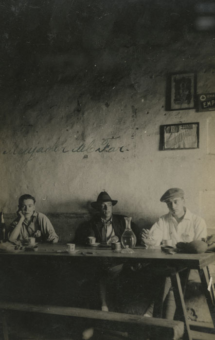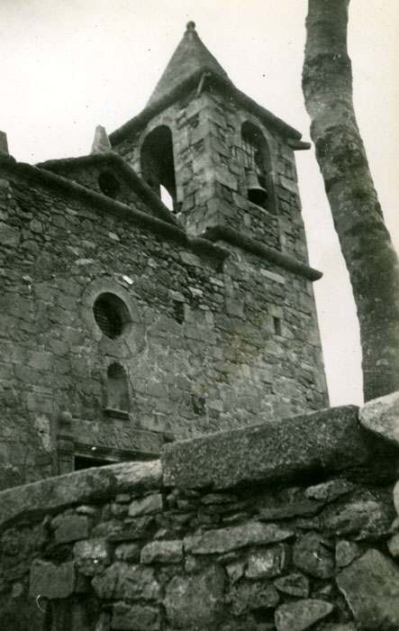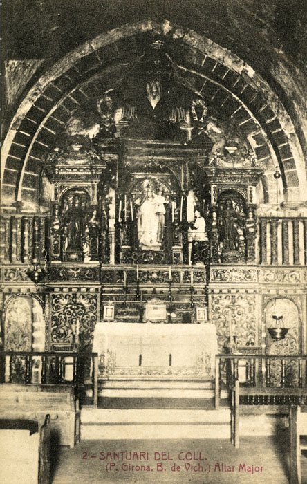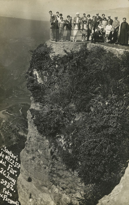 El santuari del Far, a 1.123 m d’altitud, restaurat el 1970, presideix aquest sector, i va pertànyer a la demarcació de l’antic castell de Fornils, situat al peu de la cinglera, propietat tradicional dels vescomtes d’Osona-Cardona, que més endavant passà a la baronia i posterior marquesat de Rupit. La primera referència és del 1269, ja dins la parròquia de Cantallops, amb els masos dels Esqueions, la Jaça, Armadans, Codolosa, l’Om de Valli-sana, el Solanot, les Vinyes i l’Argelagós, del qual avui només són habitats el santuari i el mas de l’Om de Valli-sana, amb edificacions del 1594, del 1617, del 1733 i altres de més modernes. ![]() Pagès amb una carreta amb dos bous a l'hostal del santuari de la Mare de Déu del Far. 1924-1936. Francesc Blasi i Vallespinosa. Arxiu Fotogràfic Centre Excursionista de Catalunya - (Ampliar)