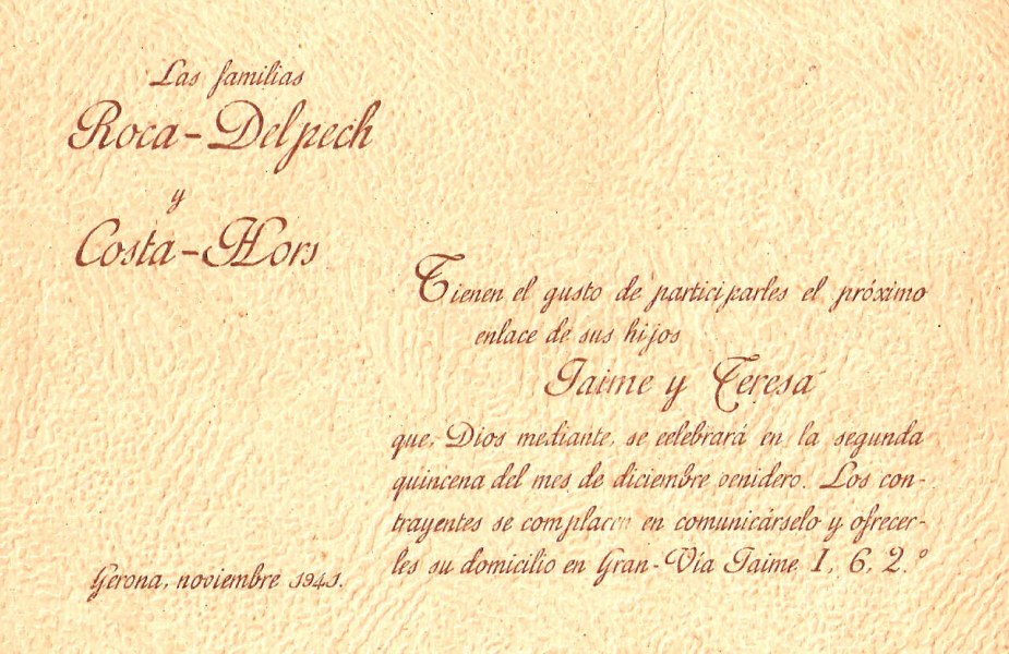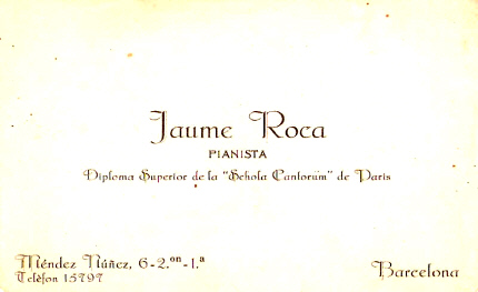 Però l'esclat de la Guerra Civil va trencar aquesta dinàmica i amb pocs anys decantarà la seva expressió artística cap a un altre camp ben diferent: la plàstica. Les seves actuacions musicals s'aniran espaiant; la darrera fou l'any 1934 al Palau de la Música Catalana. ![]() Barcelona 1934. Jaume Roca a la seva acadèmia de piano del carrer Méndez Núñez. [Ampliar] ![]() Targeta de l'acadèmia de Jaume Roca, pianista. 1934. ![]() Participació de casament de Jaume Roca Delpech i Teresa Costa Horts. Novembre 1941. |