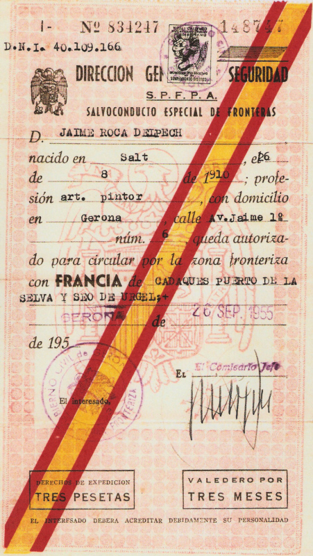![]() ![]() Esquerra: Salconduit especial de fronteres, atorgat per la Dirección General de Seguridad a Jaume Roca, autoritzant-lo a anar a Cadaqués, Port de la Selva i la Seu d'Urgell. 26 de setembre de 1955. Dreta: París, amb la seva esposa i el seu fill. 1952. ![]() Jaume Roca amb Josep Ramis, a Girona. 1955-60. [Ampliar] ![]() Jaume Roca amb Josep Ramis, a Besalú. Ca. 1955-60. [Ampliar] |