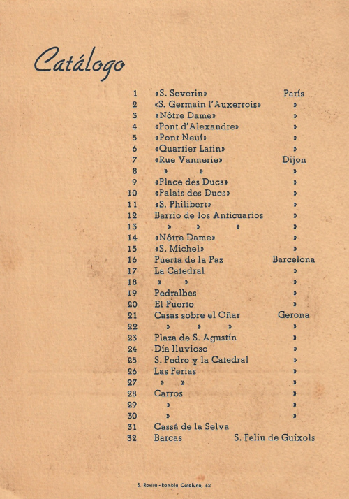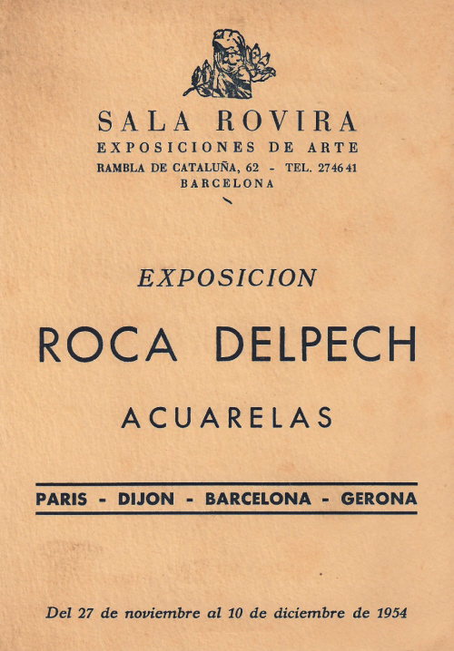 ![]() Revers del Catàleg de l'exposició d'aquarel·les a la Sala Rovira de Barcelona, amb temàtiques de París, Dijon, Barcelona, Girona i Sant Feliu de Guíxols. Novembre-desembre 1954 [Ampliar] |