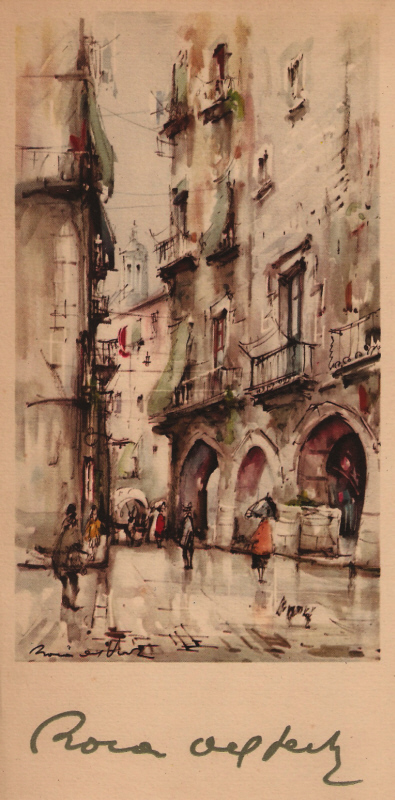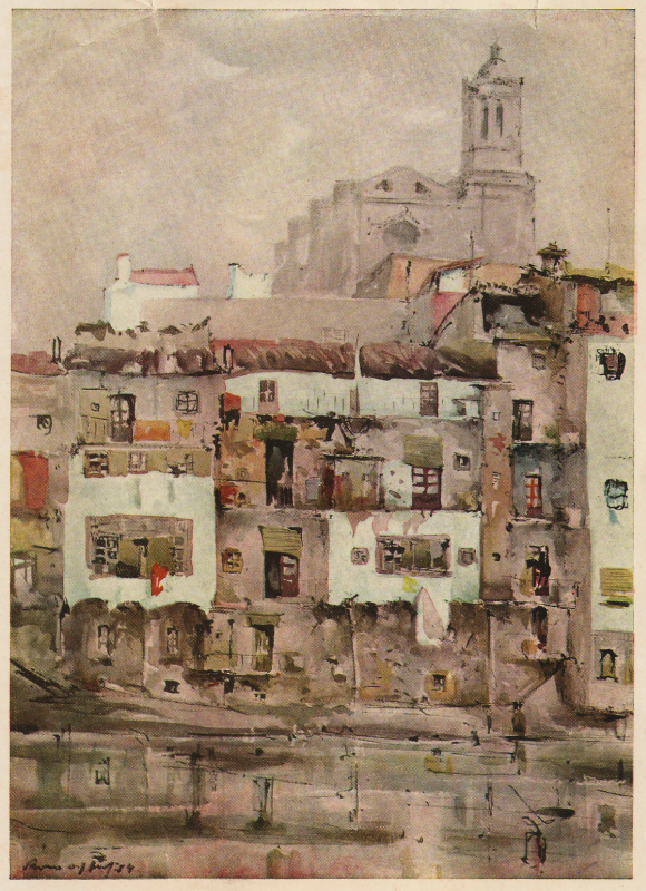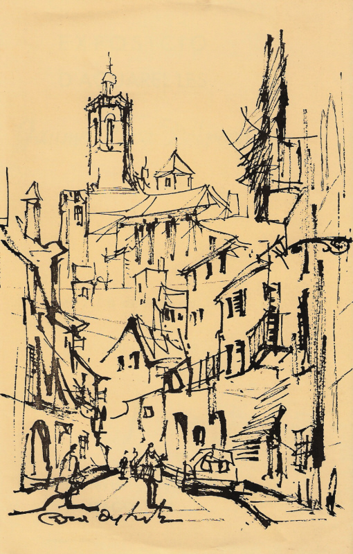 ![]() Obra reproduïda al catàleg de l'exposició d'aquarel·les de París, a la Sala Rovira de Barcelona, el novembre de 1959, les Voltes d'en Rosés de Girona. [Ampliar] |