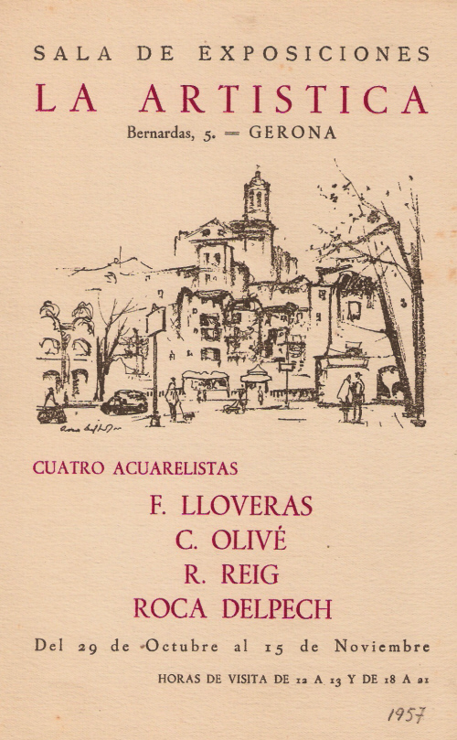 ![]() Catàleg de l'exposició d'aquarel·les a la Sala d'Exposicions La Artística, de Girona, l'octubre-novembre de 1957. [Ampliar] |