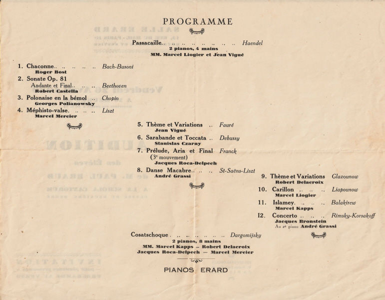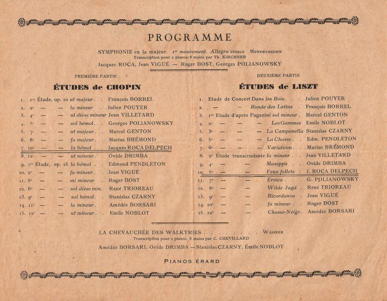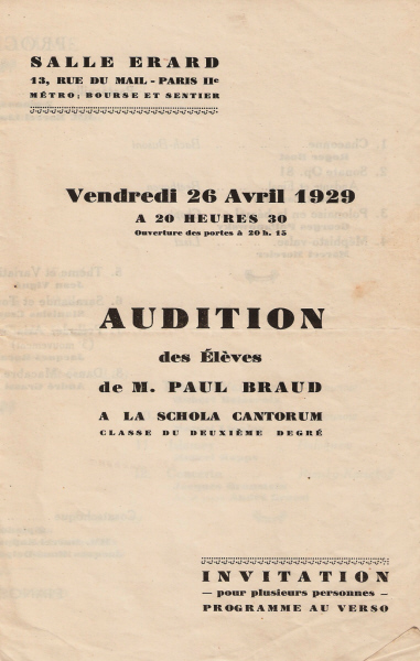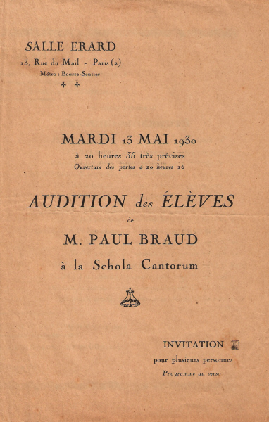Jaume Roca, a París Programes de les audicions que donàven els alumnes de Paul Braud de la Schola Cantorum a la Sala Érard de Paris el 1929 i 1930. Entre els alumnes hi actuà Jacques Roca-Delpech. |