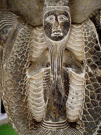 Aquest mateix tema l'hem trobat en el creuer de l'església (capitell T), però presentat d'una manera totalment distinta, molt més discreta. A més, contrasta el caràcter de la sirena de l'interior de l'església amb aquestes del claustre. Aquella escultura és més rústega i més dura. Aquestes sirenes del claustre són d'una labor filigranada.