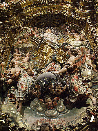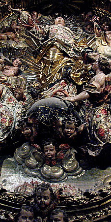 Al voltant de la figura central de la Mare de Déu apareixen tres sants més: a la dreta, Sant Feliu l'Africà i Sant Ramon de Penyafort a l'esquerra. Sota l'òval central, comnpletant la tríada, l'escena de la mort del jesuïta Sant Francesc Xavier.