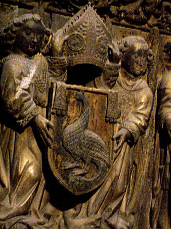 Detall de l'escut, timbrat amb la mitra, del bisbe Bernat de Pau.