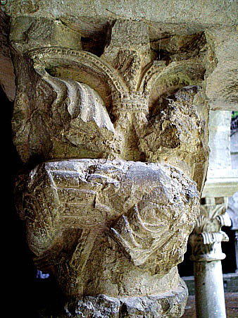 Capitell nº 31Capitell decorat amb escena de discòrdia sobre fons vegetal, compost de fulles i tiges encintades. Dos personatges s'enfronten amb armes, envoltant l'escena la totalitat del capitell. ![]() ![]()