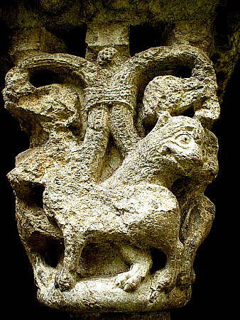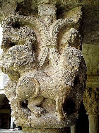 Capitell decorat amb parelles de lleons afrontats i sobreposats dos a dos de forma inversa a cada cara, sobre un fons vegetal de tiges, fulles i fruits als extrems.
