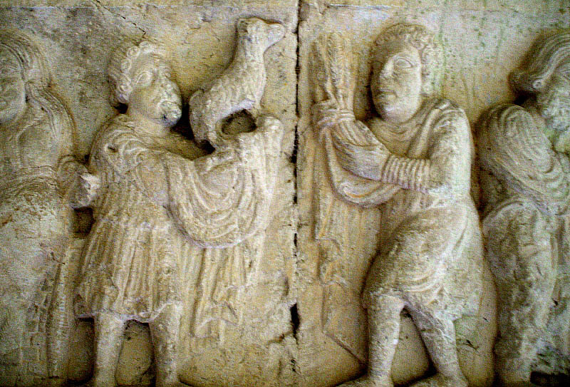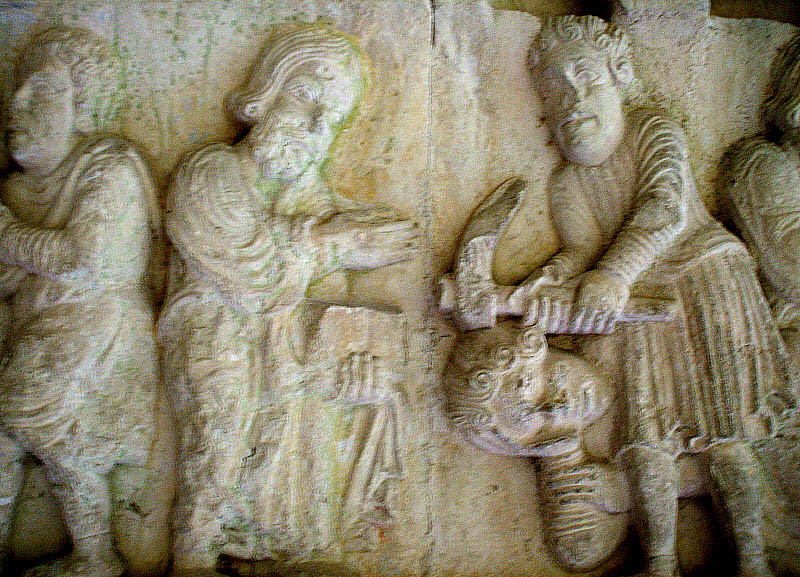 ![]() Pilar nº 9 (P9), Segon fris Pilar sud-occidental. En aquest fris s'hi representen diverses escenes del Gènesi, continuació de la seqüència explicada en el fris anterior. Desenvolupa quatre episodis: la condemna al treball, ofrenes de Caïn i Abel, la mort d'Abel, i l'encàrrec de Déu a Noè de construir l'arca.