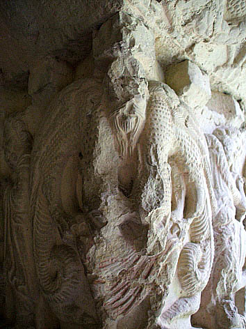 Pilar nº 9 (Capitell a l'extrem, segon fris)A l'extrem nord-est, se sitúa una escena que representa la submissió de dracs per part d'un personatge, formant la frontissa entre la seqüencia d'escenes esmentades i la següent. Bibliografia: