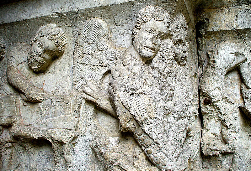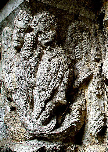 Pilar nº 9 (Capitell a l'extrem, tercer fris)Detall de les figures de l'anterior imatge parella de sirenes, temàtica emparentada amb un altre capitell gironí, del claustre de Sant Pere de Galligants, l'identificat com capitell nº 39, i en un creuer de la mateixa església, tot i que seguint una imagineria ben diferenciada en un i altre cas. Bibliografia: