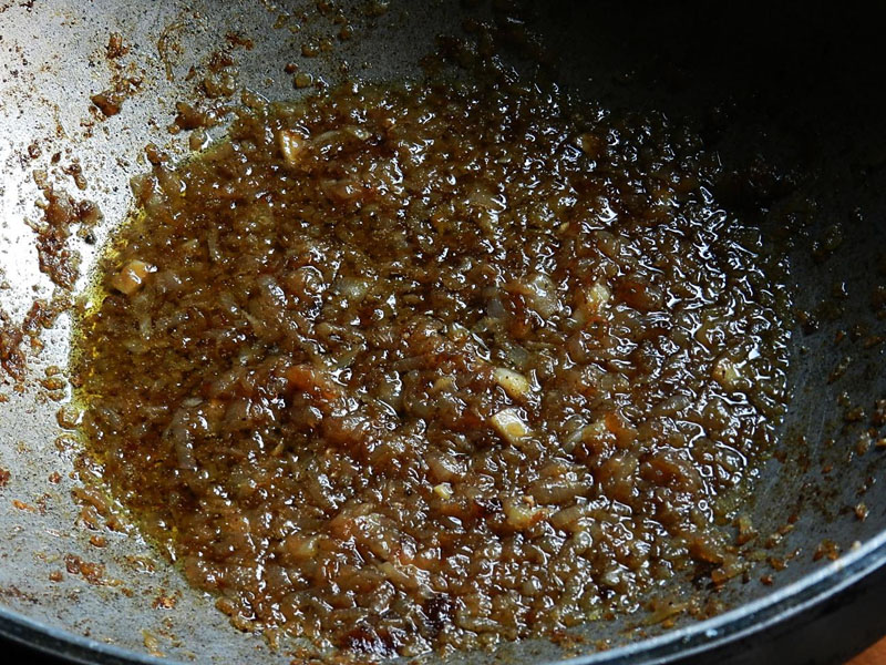 No podem tenir pressa quan fem aquest sofregit, en tot cas, si volguéssim accelerar el procés podem fer-ho amb un foc una mica més alegre, però llavors no hem de parar de remenar, gairebé contínuament. Veieu l’aspecte de la ceba en la foto; aquí rau el secret d’aquest plat (Foto).