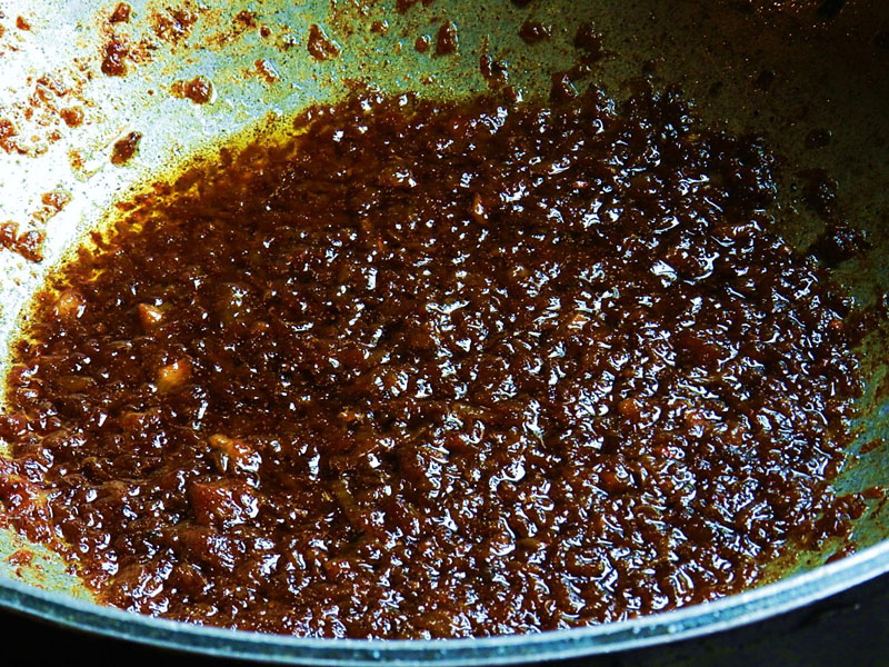 Com més avança la cocció, més atenció hem de prestar a la cassola, quan més sovint remenem la ceba millor. A mesura que es va "confitant" la ceba i que avancem en el procés, va augmentant el risc de que se’ns enganxi i se’ns cremi, per això i per allargar la cocció i aconseguir el desitjat color marronós fosc que busquem, anirem afegint rajolins d’aigua a la cassola. Aquesta mica d’aigua atura el fregit de la ceba i desglaça la que s’ha pogut començar a enganxar al cul de la cassola, en pocs moments l’aigua ja se’ns ha evaporat i continuem amb la reducció de la ceba anant remenant (Foto).
