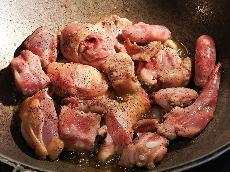 - 400 grs de carn tallada a trossos petits. Costelló de porc principalment, podeu incloure bocins de pollastre i conill, o salsitxes