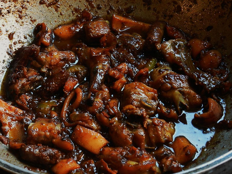 Un cop fet el sofregit, tornem a incorporar a la cassola els trossos de carn, la sèpia i les tires de pebrot.