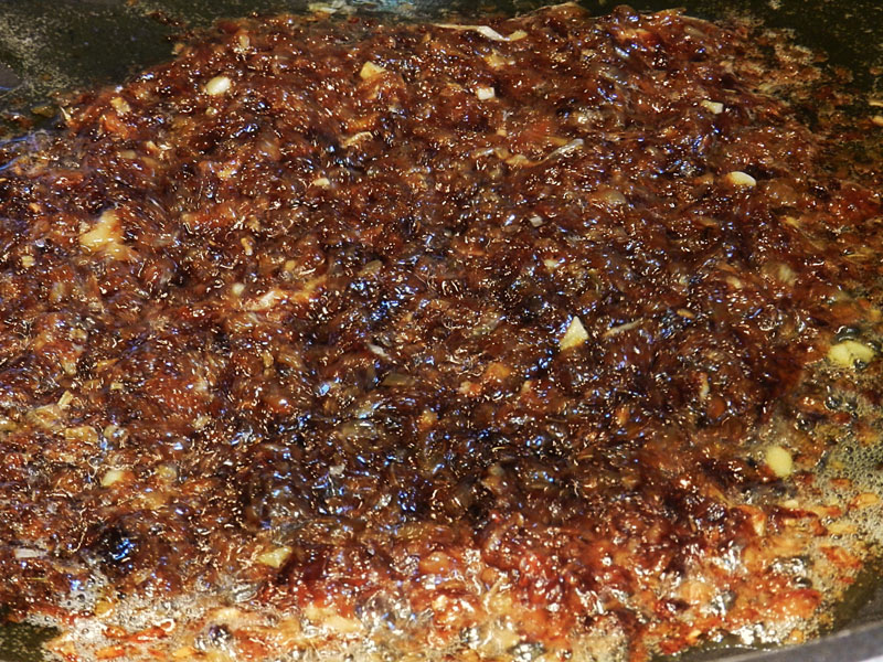 Reservem el conill enrossit i en la mateixa cassola començarem a fer-hi un bon sofregit. Cal que piquem la ceba ben menuda a ganivet i la comencem a sofregir sense presses fins que vagi agafant un color marronós. Hi afegim sal. Per allargar la cocció de la ceba i que no se’ns cremi podem afegir-hi rajolins d’aigua. Anem remenant i treballant el sofregit. La ceba ha de quedar amb textura de confitura i ben fosca. Com sempre hem d’insistir que al sofregit li hem de donar el seu temps i és un dels puntals del plat. Un cop la ceba ben reduïda hi afegim la tomata madura ratllada i continuem a foc suau el sofregit una estona més. Al final hi tirem una dent d’all tallada ben menuda i quan enrosseixi hi aboquem la copa de vi ranci i deixem reduir cinc minuts més (Foto).