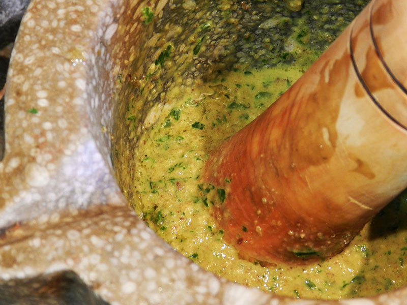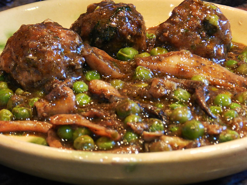 Un cop hem posat la sèpia i les pilotilles a la cassola aprofitarem per fer la picada. En el morter picarem primer el gra d’all i les ametlles i avellanes, quan tot sigui una pasta fina afegireu el julivert picat i la llesca de pa que tindreu fregida fins que quedi tot ben desfet, finalment afegiu la salsa de la sèpia i la copeta de vi ranci i ho remeneu fins que quedi tot integrat. Si feu servir la salsa (hepatopàncrees) de una sèpia grossa, no li poseu tota, doncs el gust final podria quedar inclús massa pujat. Per una cassola de quatre persones amb una cullerada sopera de la salsa de la sèpia n’hi hauria prou. La picada ens aportarà gust i untuositat a la salsa de les mandonguilles i espesseirà el brou. Opcionalment podeu posar-hi una presa de xocolata negre a la picada. Si no teniu morter podeu fer la picada amb una batedora. La picada l’hauríem d’abocar a la cassola uns quatre o cinc minuts abans de tancar el foc una mica després dels pèsols (Foto).