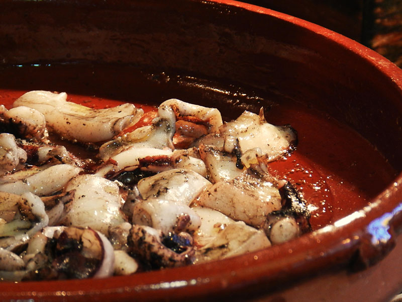 Aneu amb compte que l’all es crema ràpidament. Deixeu confitar i reduir la tomata i llavors hi aboqueu mitja copeta de vi ranci. Si no en teniu podeu fer servir conyac, o també vi blanc sec o xerès sec. Deixeu reduir el vi uns cinc minuts i incorporeu altra cop els trossos de sèpia a la cassola amb el sofregit i deixeu uns minuts que s’integri amb el sofregit. (Foto A - Foto B)