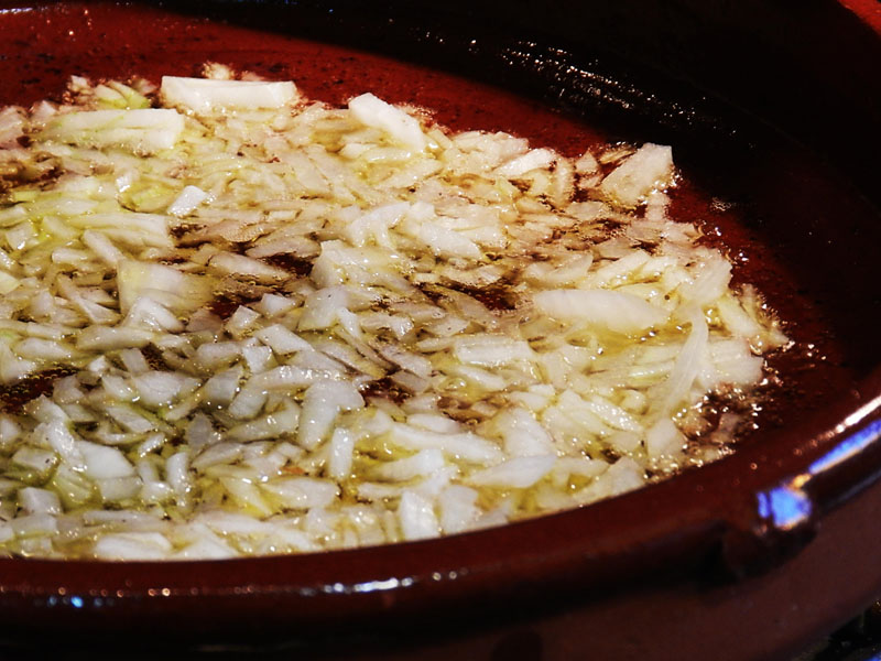 (Foto) Un cop enrossits els trossos de sèpia els reserveu en un plat, i en el mateix oli començarem a fer el sofregit. Com és habitual haurem tallat a ganivet i a bocins ben petits la ceba que l’abocarem a la cassola, els primers dos o tres minuts a foc fort tot remenat la cassola amb una cullera o espàtula de fusta per desglaçar els socarrats de la sèpia, abaixem el foc, salem la ceba, i anem fent el sofregit. Cada tres o quatre minuts l’anem remenant per aconseguir una cocció uniforme i confitada.