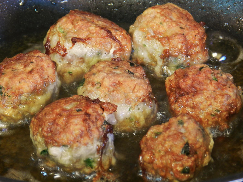 Un cop les hi heu donat forma les enfarineu i, sacsejant-les amb les mans, les hi traieu l’excés de farina. Tot seguit en una paella amb un dit d’oli ben calent, les fregiu a foc alegre per tots costats fins que quedin enrossides. Les reserveu sobre un paper absorbent per treure'n l'excés d’oli. Aquest oli ja el podeu tirar, no l’aprofitarem. Veureu que en moltes receptes aquest oli s’aprofita per fer-hi el sofregit, però en fer-ho així correu el risc que la farina de les pilotilles s’hagi cremat en l’oli, i tot i que el coleu, aquest gust no desitjat sigui present en la cassola final.