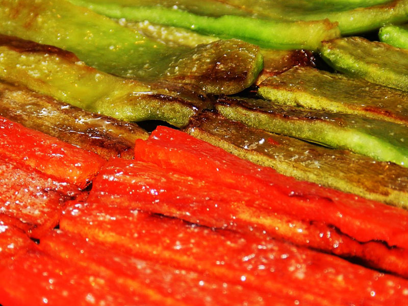 Sobre el mateix oli poseu el pebrot verd i el vermell tallat a tires o bé trencats amb la mà a trossos regulars. Saleu-los. Aneu-los sofregint a foc suau fins que comencin a agafar un color torradet. (Foto).