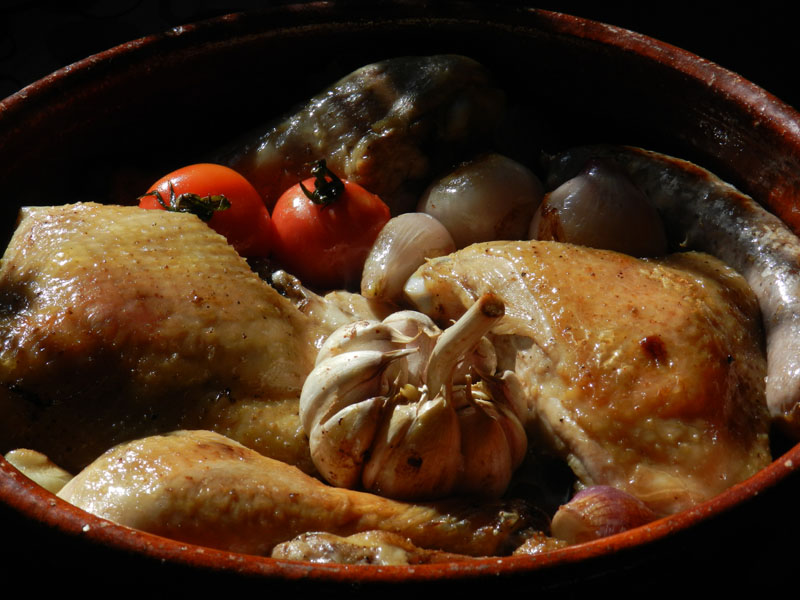 Aquesta mena de rostit, del que ja en tenim testimonis a l’època medieval, era un dels plats més anhelats per tothom, quan menjar un pollastre era tot un luxe. El rostit “a la catalana” és un plat en que concentrem en una cassola els gustos de les carns que han estat guisades de manera pacient i sàvia, sense sofregits ni picades, a foc suau, amb pocs afegitons. Anem a buscar el gust de la bona carn rostida tal i com és, sense màscares, més enllà d’algun acompanyament modest de la ceba, l’all, un raig de vi, i el contrapunt si voleu d’alguna pruna i de la canyella.